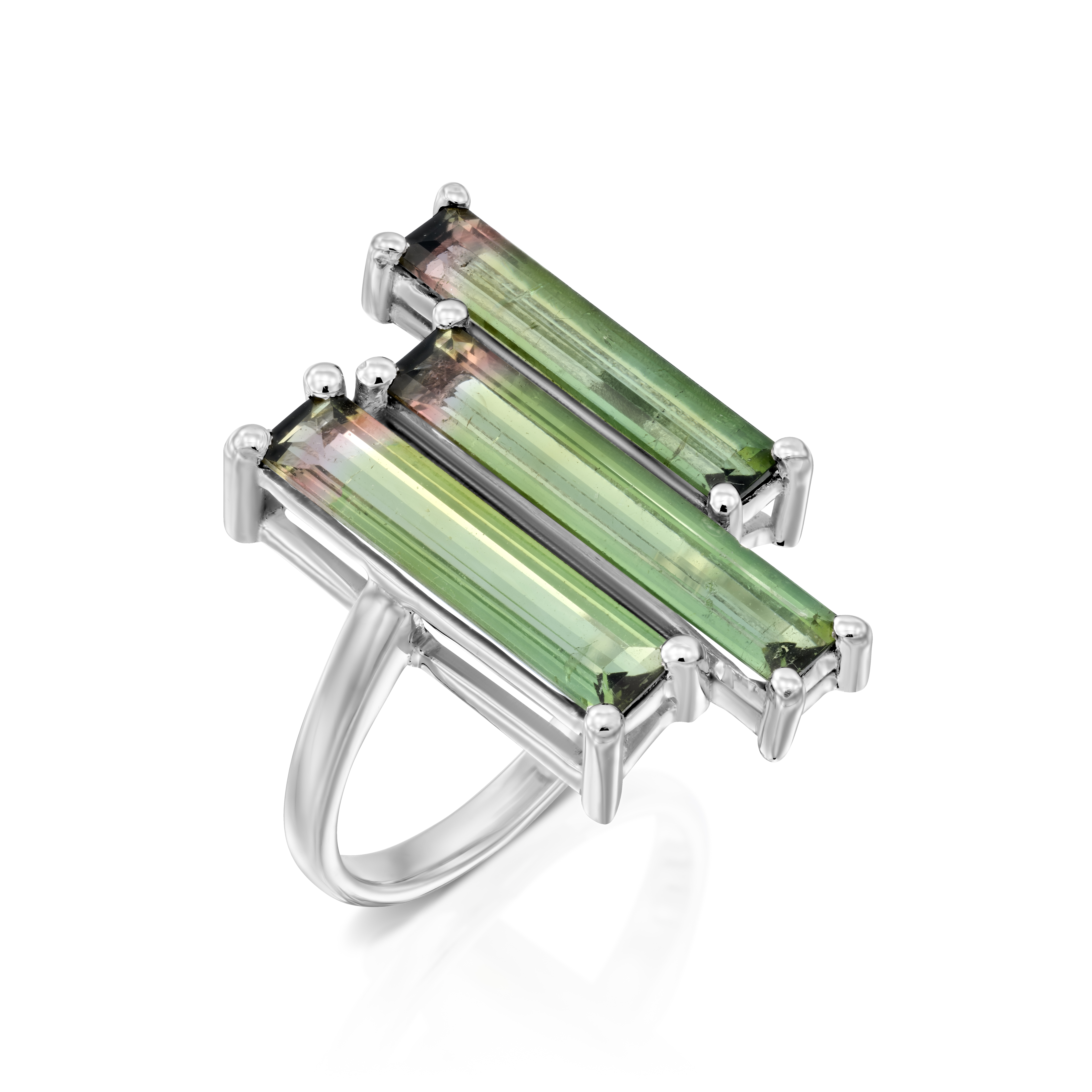 14K white gold ring set with baguette-cut natural tourmaline stones